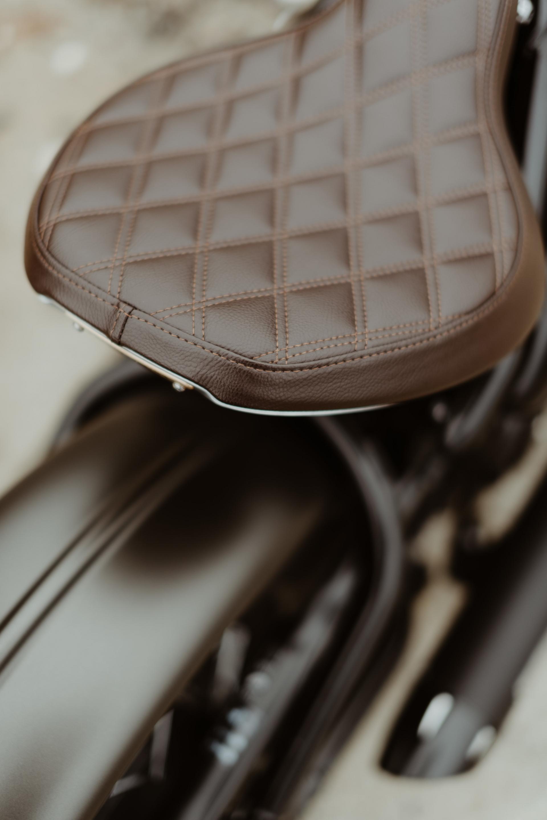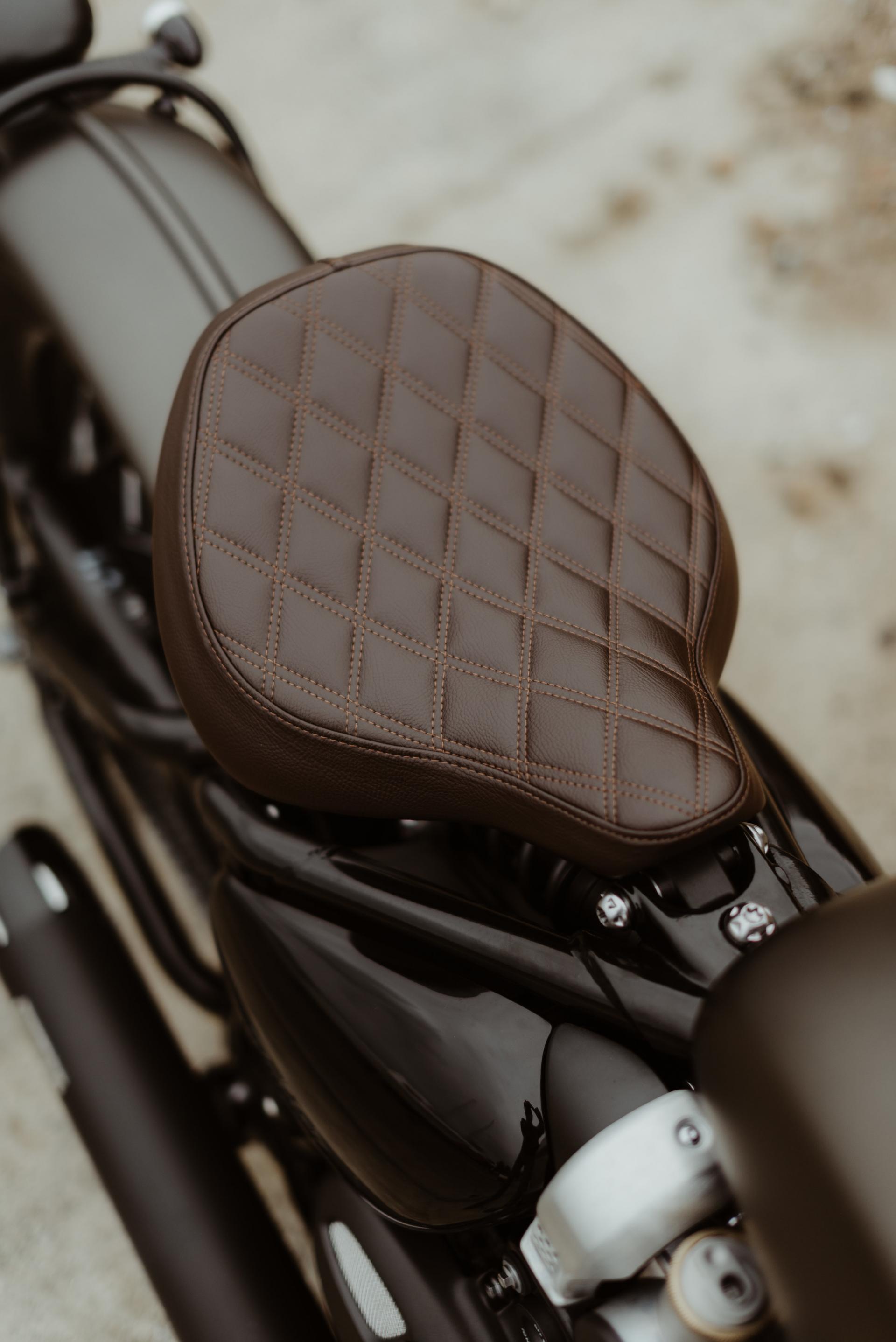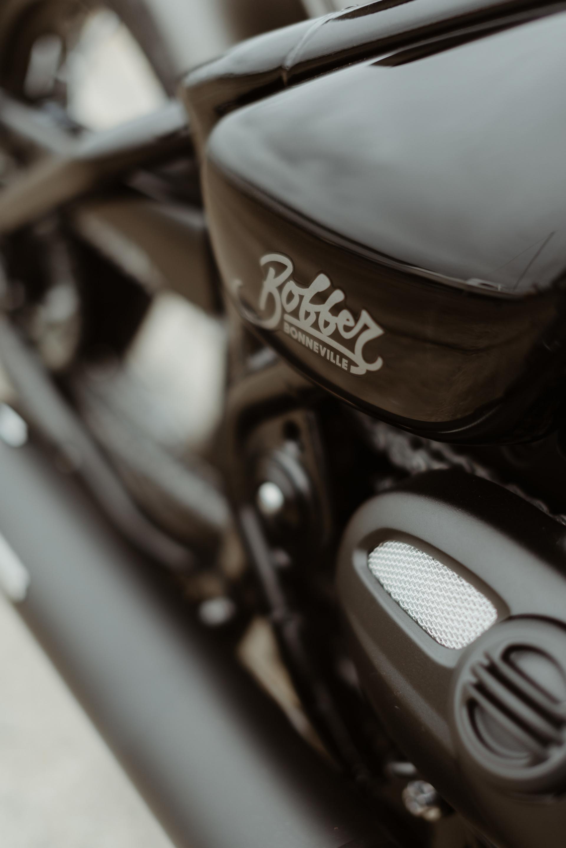 1200 BOBBER IRONSTONE peinture des garde-boues avant et arrière, passage des carter en full black, ligne d'échappement complète noire, clignotants LED, selle matelassée marron, rétroviseur gauche embout de guidon.