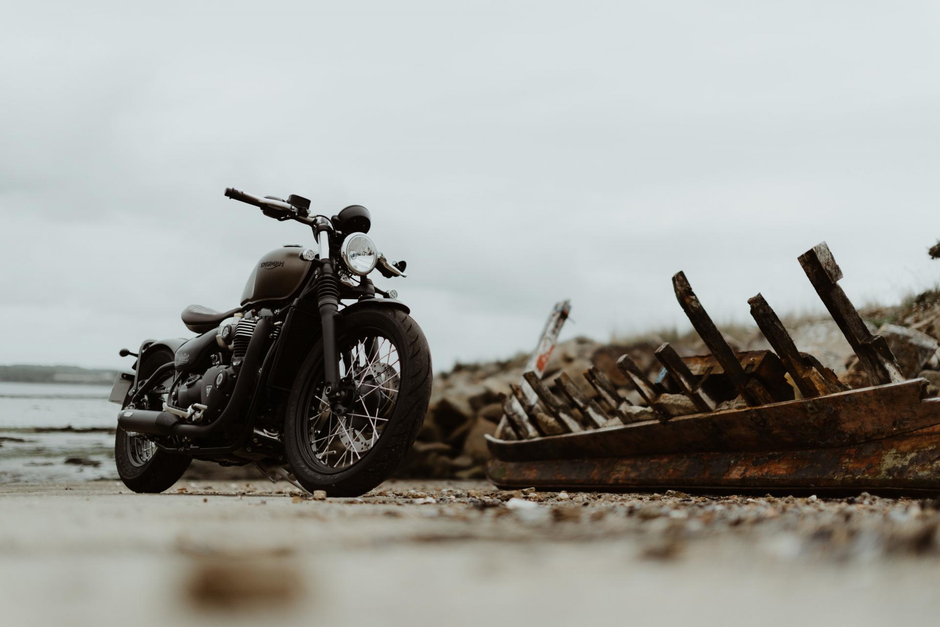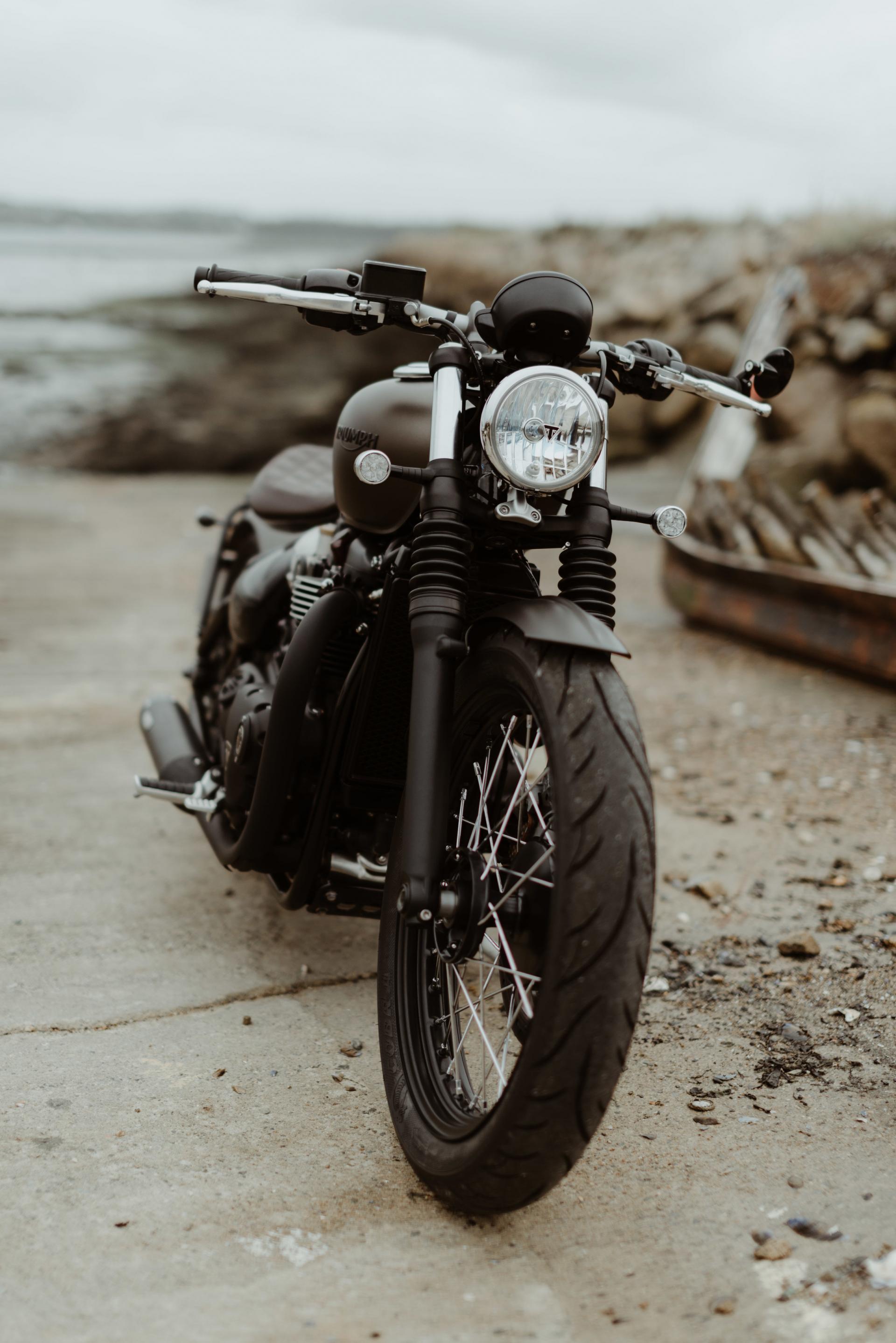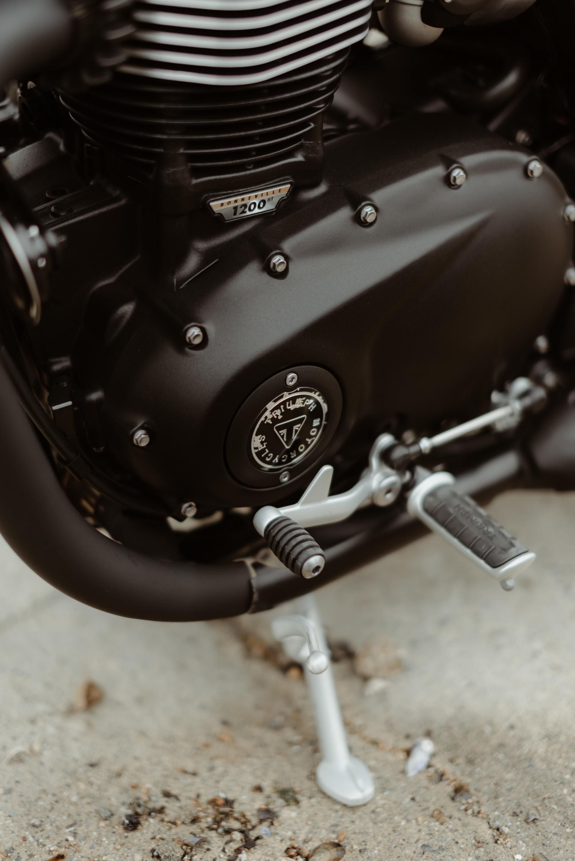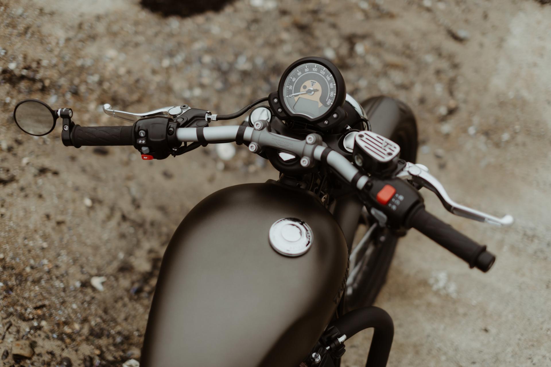 1200 BOBBER IRONSTONE peinture des garde-boues avant et arrière, passage des carter en full black, ligne d'échappement complète noire, clignotants LED, selle matelassée marron, rétroviseur gauche embout de guidon.